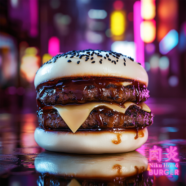 👉 Niku Honō (肉炎) : double steak de bœuf grillé, pickles de chou rouge, Oignon confit, emmental fondu,oingon rouge, une généreuse sauce yakitori et sauce Barbecue, le tout dans un bun bao blanc moelleux parsemé de sésame noir