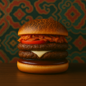 Double steak, emmental fondant, kimchi, tomate et sauce Korean fumée… un burger original, puissant et terriblement gourmand.