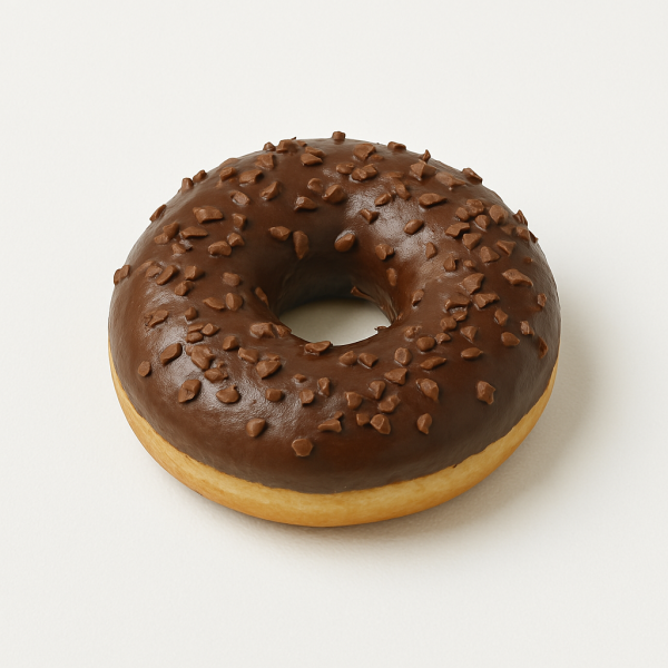 Donut moelleux nappĂ© dâun glaçage chocolat et dĂ©corĂ© de copeaux cacaotĂ©s.