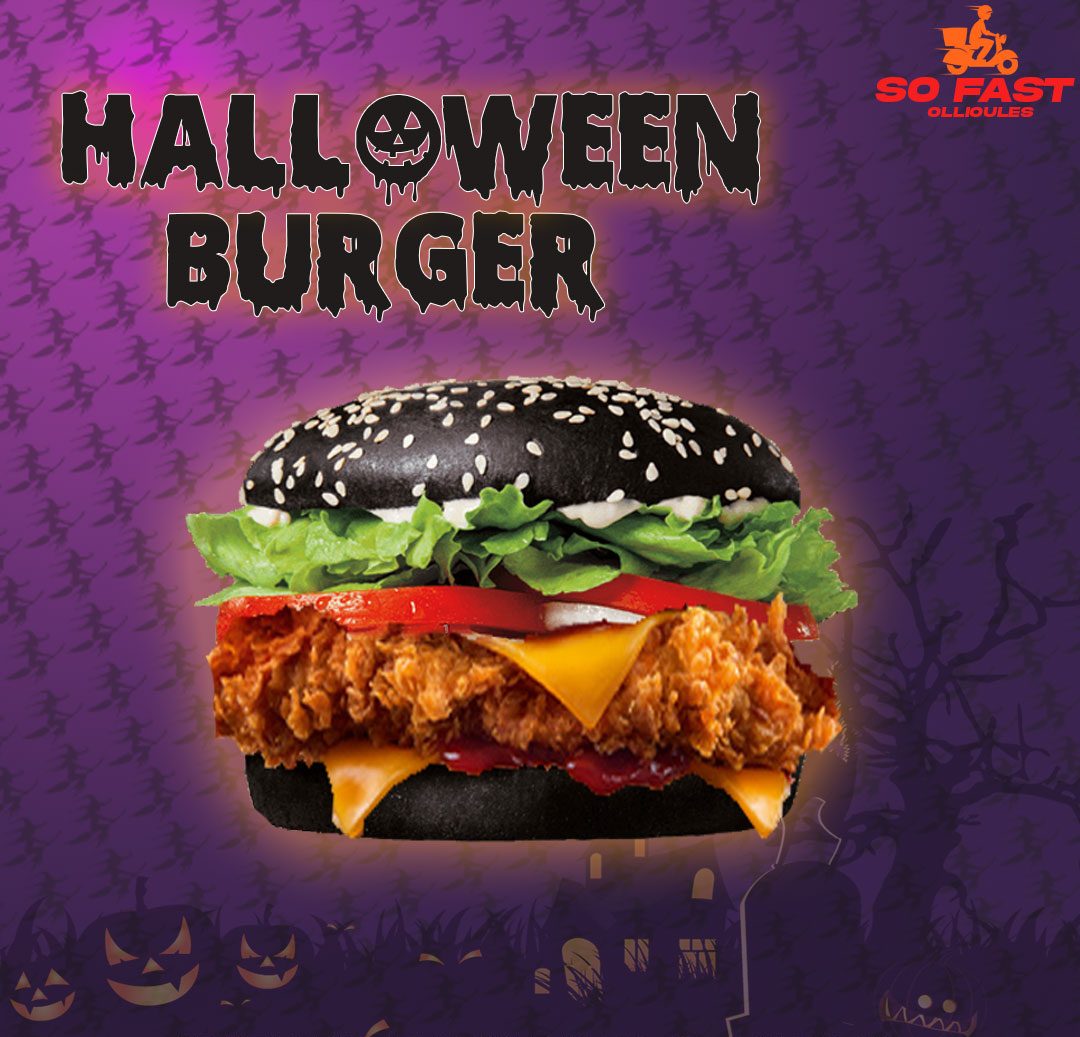 🎃Halloween Burger🎃: Pain noir, Salade, Tomate, Oignon, Bacon, Steaks boeuf ou Tenders, Cheddar et Sang de zombie 😱🧟♂️😱